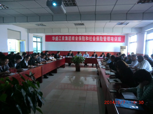 2014年5月7日下午14時,華盛江泉集團人力資源部組織開展商業(yè)保險與社會保險管理培訓班,參加培訓的人員有華盛江泉集團人力資源部部長李新勝、集團工會主席付冬明、人社中心主任楊琳琳、法務部法律專責劉學權、集團人力資源部社保專責宋紅、商業(yè)保險專責朱永宇、建筑公司安全科陳慶鋒以及各單位社保、商業(yè)保險負責人與經(jīng)辦人。
